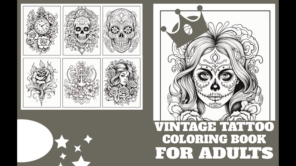 Unique Vintage Designs : Intricate tattoo-style illustrations featuring old-style roses, anchors, skulls and more, perfect for adult coloring enthusiasts.